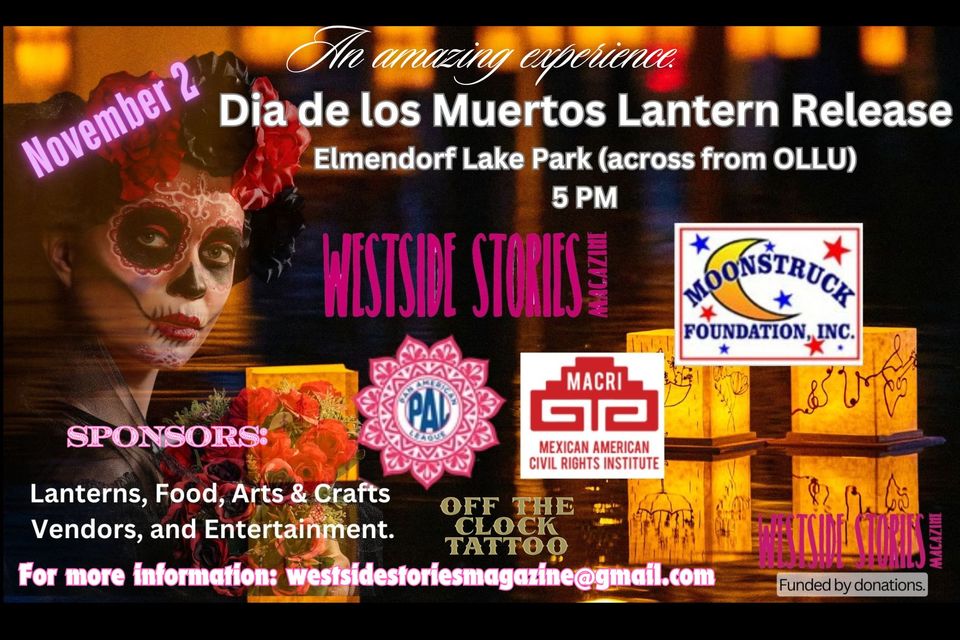 Lantern Release Celebration at Elmendorf Lake Park hosted by Westside Stories Magazine. Beginning at 5pm, visitors may expect vendors, arts & crafts, food and entertainment. For more information, contact organizer Yvonne Pena at (210) 872-7319 or email at westsidestoriesmagazine@gmail.com.