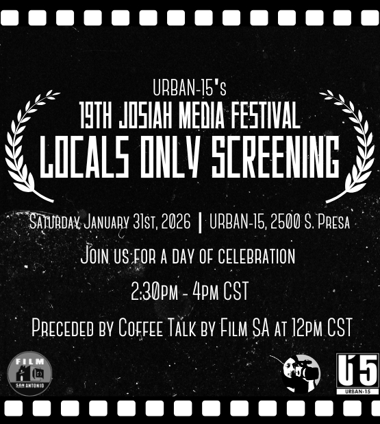 URBAN-15 is proud to present the 2025 JMF “Locals-Only” Screening! Join us on Saturday, January 31st at 2:30pm for a screening of films made exclusively by filmmakers from San Antonio and the surrounding area! Emcee’d by Say Sí Theater Arts Director and “Las Hijas de La Madre” Founder / Frontwoman Amalia Ortiz, this curated collection of films will highlight the works of local filmmakers. This event will be held at the URBAN-15 studio at 2500 S. Presa, and will be FREE to attend and open to all ages!