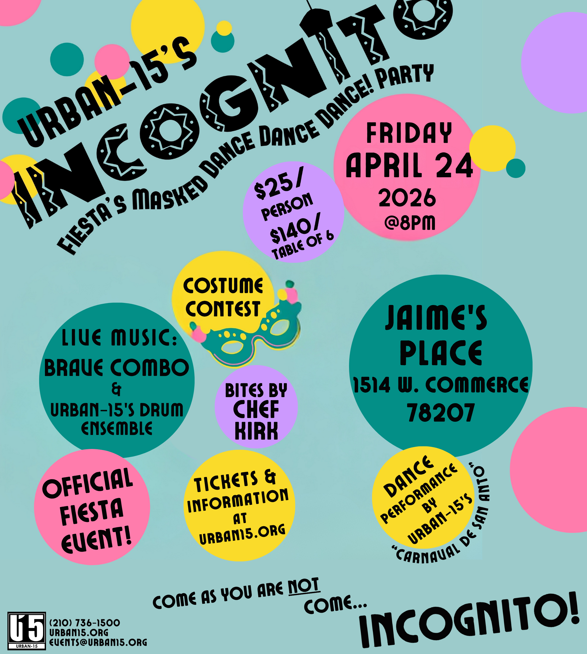 URBAN-15 invites Fiesta lovers to the 2026 Incognito Masquerade Dance Party, a triumphant return to the Fiesta Celebration’s most anticipated costumed event! This year’s celebrations will include dance performances by URBAN-15’s Carnaval de San Anto, live music by URBAN-15’s drum ensemble & two-time Grammy Award winning group Brave Combo, as well as food by Food Network champion and locally celebrated culinary master Chef Kirk. Also occurring at this year’s event will be the one and only Incognito costume contest, all attendees are encouraged to create their own costumes and participate in this one of a kind contest!